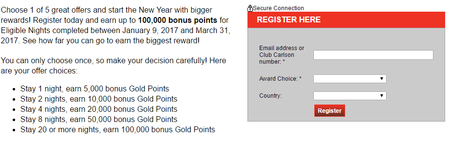 Register for the promotion here. You simply need to provide either the email for your Club Carlson account or your Club Carlson Gold number, your choice on which promotion you want to register for, and the country you live in. The promotion window is for stays between January 9th and March 31st, 2017.