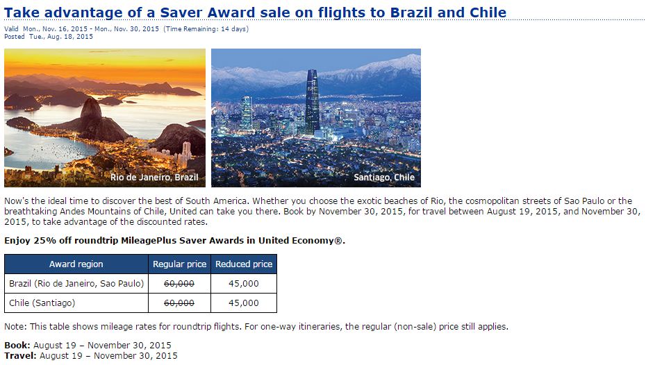 United has been offering a 25% reduction on award flights to Brazil (Sao Paulo, Rio de Janeiro) and Chile (Santiago) for a few months. Instead of the normal 60,000 miles required for a roundtirp ticket from the US, it’s only 45,000 United miles for a limited time only for a roundtrip.