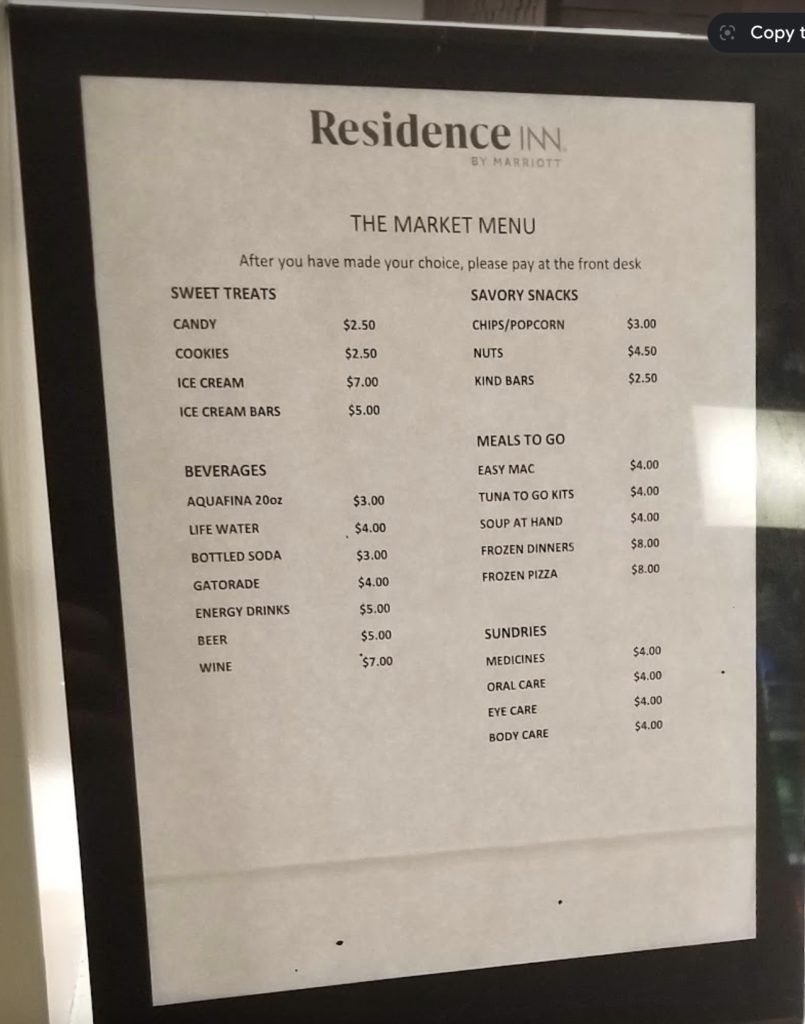 I did ask about the manager’s reception that many Residence Inns used to offer (aka free hotel dinner) and the clerk checking us in said that had not been back since COVID and he didn’t expect it to ever come back. I don’t know if that’s just at this particular hotel or if that’s more of a Residence Inn chain-wide policy.