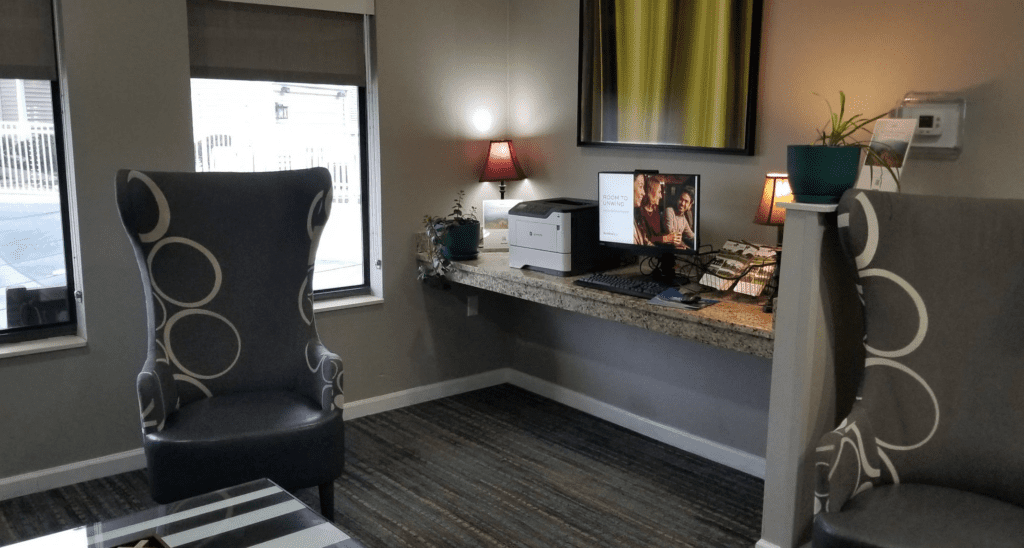 There isn’t a separate business center, however there is a small computer and printer area next to the front desk that is available for guests, if you need to print a boarding pass, directions or anything.