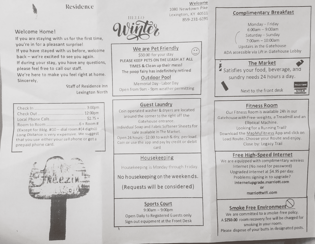 The Residence Inn Lexington North is complimentary and spacious. Because there are several different buildings in the Residence Inn complex, you will want to check in before you unload your stuff to find out which building you are in. Then you can pull your car around to your building.