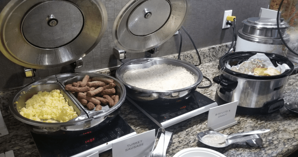 There were eggs, breakfast potatoes, sausage and bacon and biscuits on the day that I was there, though I imagine it is switched up each day.