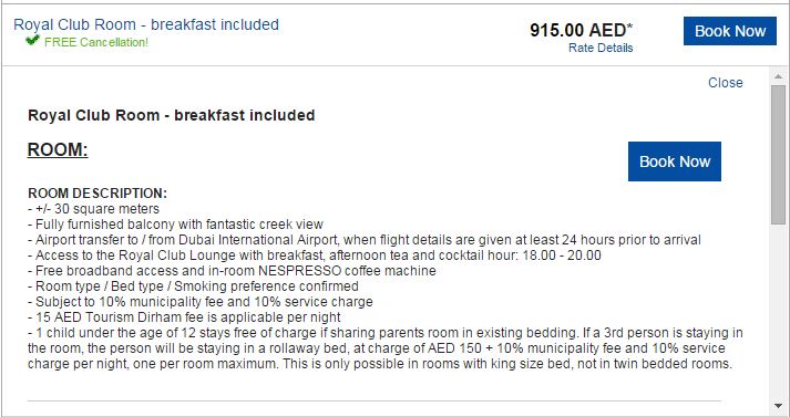 Thank you but no (AED468 is approximately USD$125!) – I figured I’d take my chances at the desk. When we got there, I inquired about being upgraded to a club room, the desk agent said that she could upgrade me to a Royal Club room but without the actual club access!?! Funny – on the hotel’s website room description, there doesn’t seem to be any such distinction