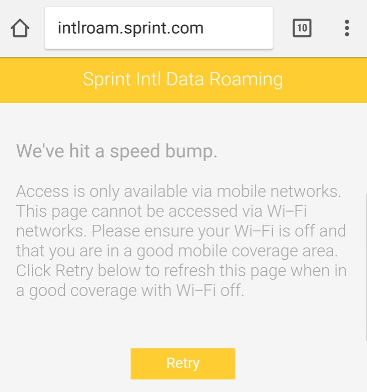 You just go to intlroam.sprint.com. Note that you have to go to this page to upgrade to the 3G data on the Sprint International Plan from your phone, and you have to do it while you’re not connected to any wi-fi networks. Otherwise you’ll get a page like this