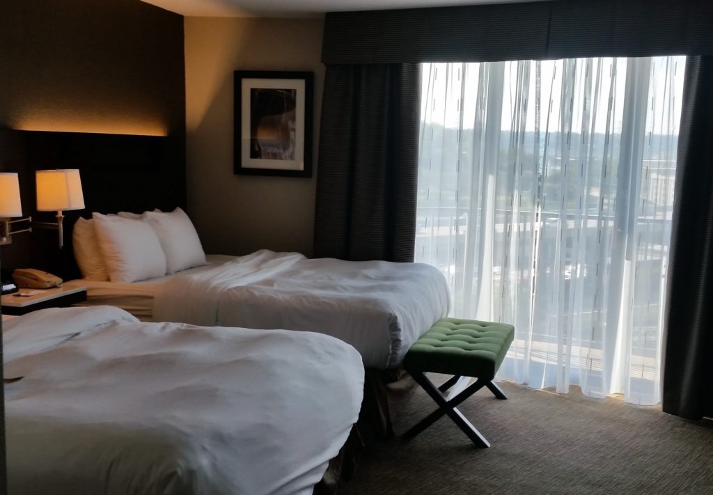 All of the rooms are exterior but only the revolving restaurant actually revolves, so you’re dependent on room location for whether you have a view of the Cincinnati skyline or…. the Interstate 🙂 . We had a room that faced mostly northwest, so our view was pretty good