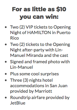 The Tony and Pulitzer Prize winner is scheduled to return to the title role during Hamilton’s limited run in San Juan, Puerto Rico. According to Prizeo, when you make a donation of as little as $10, you are entered in a contest and you can win the following: