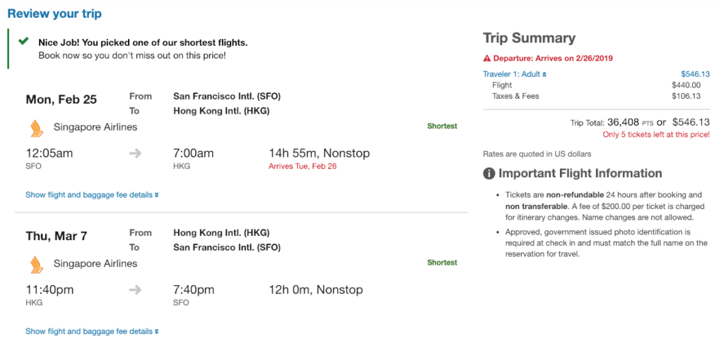 If you have points with Chase, you can fly as low as 36K URs. This is for those with Chase Sapphire Reserve. Those with Chase Sapphire Preferred will be slightly more.