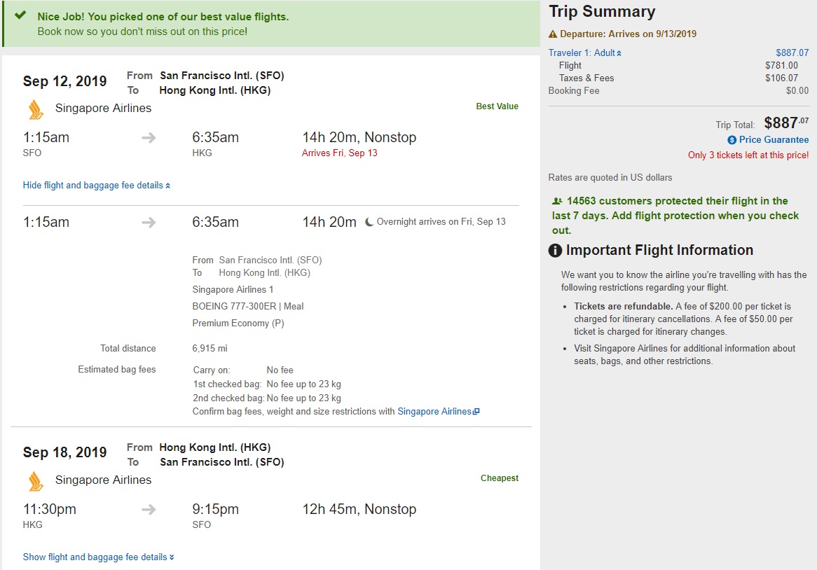 Flights across the Pacific are always long but they don’t have to be uncomfortable. Singapore Airlines is offering a great price for their new Premium Economy cabin: $888 from San Francisco to Hong Kong. Considering that discount economy flights cost ~$550 during the same period, this price can’t be beat. This is a direct flight of about 14 hours; there is no stopover in Singapore on this “5th Freedom” route. That makes this an even better deal. The discounted price is available for mid-week travel from late August through September, with a few scattered dates in October and November.