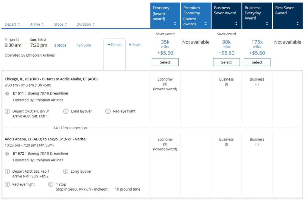 Typically I wouldn’t have clicked on the option, except it was the only one at the time. Knowing that Ethiopian flies between Seoul and Tokyo, I figured that this must be an ORD-ICN-NRT itinerary, but with the final segment on Ethiopian. But that was totally wrong.