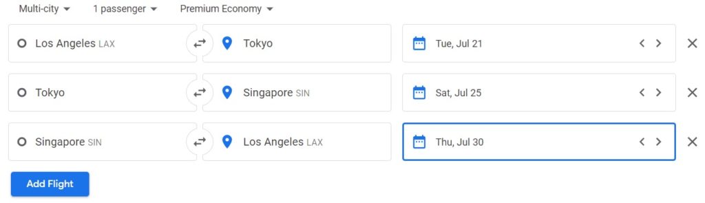 If you want to visit both Tokyo and Singapore, it’s possible to add a multi-day stop in Japan for $120 (nickohrn says $100 but I didn’t build that). To do so, simply search for “Multi-City” instead of “Round Trip” with Google Flight. First flight LAX/SFO – Tokyo, second Tokyo – Singapore, third Singapore -LAX/SFO. You should see prices consistently around $960. That’s a fantastic deal to visit 2 great cities in one trip.