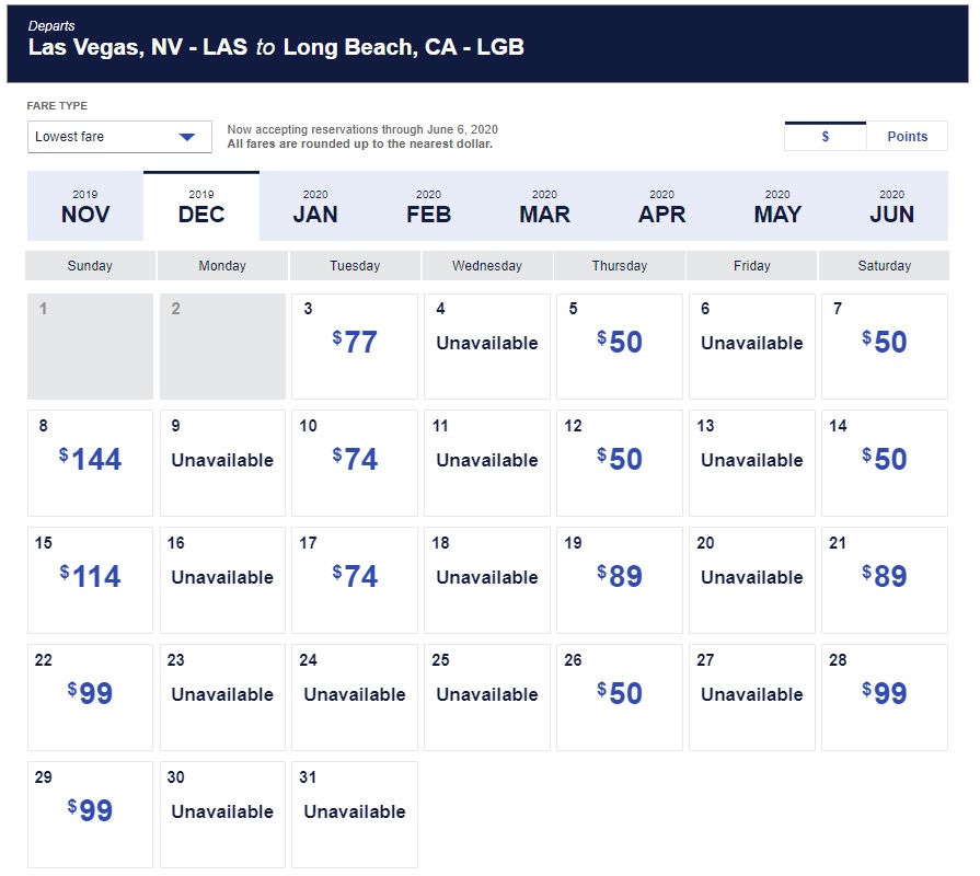 As usual, there are deals below the advertised price, and potentially below the “sale page” price as well. Like between Chicago and Houston, advertised at $121 but available for $49! Or Las Vegas and Long Beach advertised at $59 but available for $50.  Perfect for hitting the beach or casinos, depending on where you live.