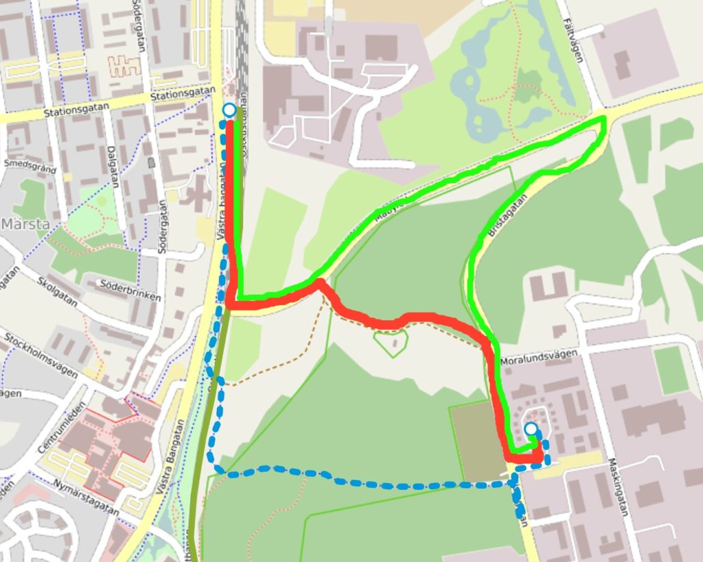 Google suggested the walk, and since it was nice out, I thought we would take the walk. Google’s suggested route is in red, from Marsta station at the top to the hotel in the bottom right of the picture