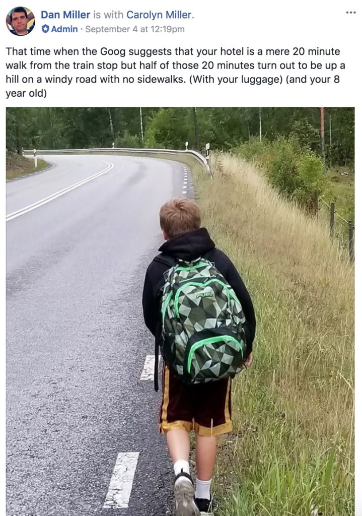 The red route goes through a trail, but as we walked along the Mabyleden road, there was no visible entrance or anything to indicate that this was a public trail (SEE ALSO: Is this a road? Or someone’s driveway). So I figured we would just continue on the road along the path I’ve drawn in green. But that turned out to be up a windy, hilly road with no sidewalks. Not my best choice in hindsight, though it was fun to see the expressions on the check-in agents when I told them how we got to the hotel :-). Or as I shared in the Points With a Crew free miles and points Facebook group