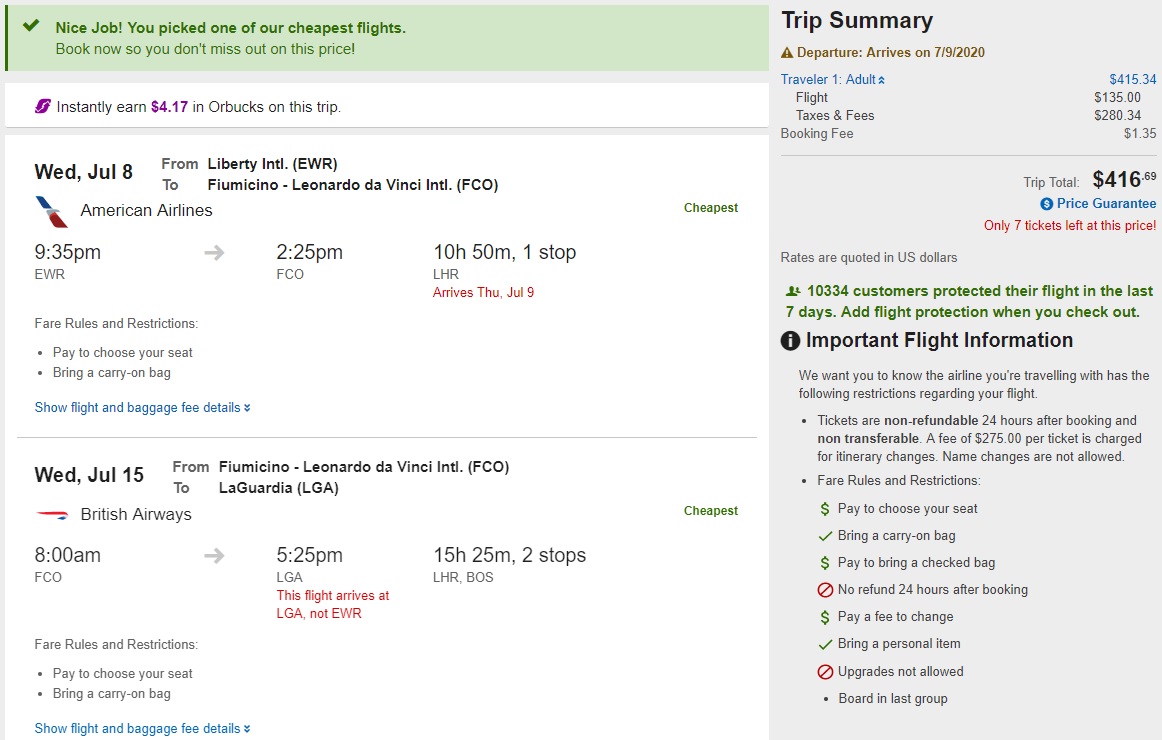 Not that this is the basic economy fare, but main cabin is pricing from just $540. Booking these fares is interesting. United/Air Canada have the lowest basic economy fare by a few bucks at $413 leaving from Newark (EWR); AA/BA are slightly higher from Newark ($417) or New York JFK ($420). But American and British Air have the cheapest main cabin at $540 to UA/AC’s $553. Your choice probably comes down to which airport is most convenient.