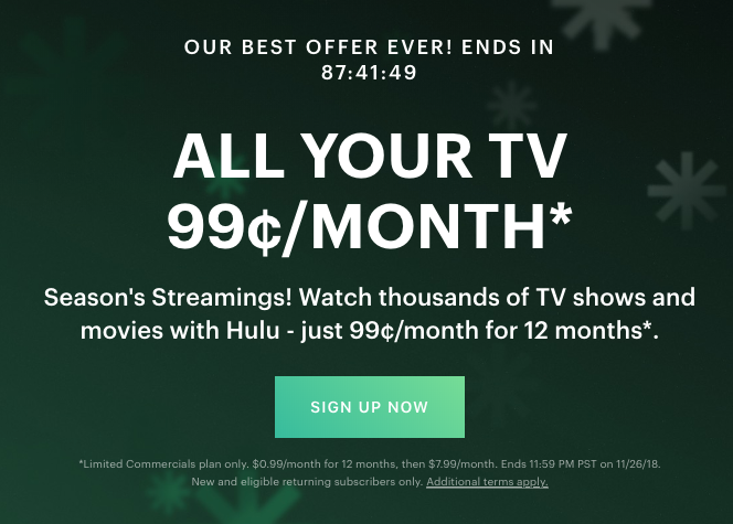Join Hulu for $0.99 cents per month – new/returning subscribers