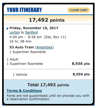For 17,492 points (16,617 if you have the Amtrak Guest Rewards World credit card), you can get a Superliner Roomette and a car. Using points saves you $496 dollars–which leaves you more money in your pocket for your time in Florida!