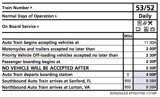 The Auto Train has a very specific boarding process, one that is highlighted on the schedule Amtrak publishes: