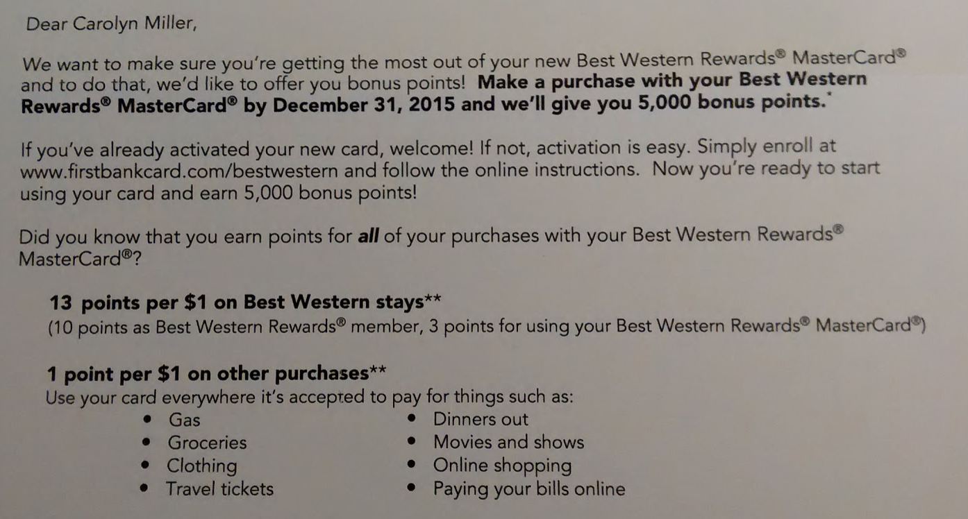 I got a letter in the mail the other day from Best Western, offering me (well, by “me” I mean my wife) 5,000 points after my first purchase