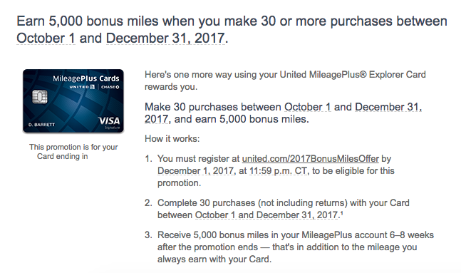 “Make 30 purchases between October 1 and December 31, 2017, and earn 7,500 bonus miles”