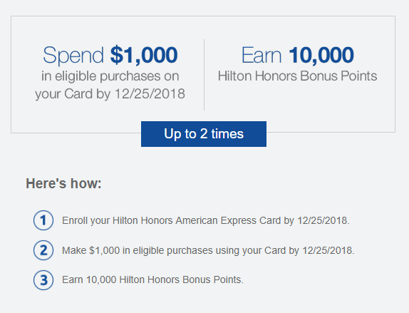 Enroll and earn 10,000 Hilton Honors Bonus Points after each $1,000 you spend in eligible purchases on your Hilton Honors American Express Card (“Purchase Requirement”) starting from the time you complete enrollment through December 25th, 2018 (“Purchase Period”), up to a maximum of 20,000 Hilton Honors Bonus Points. Enrollment period ends on December 25th, 2018. If you reach the Purchase Requirement, the Hilton Honors Bonus Points will be credited to your Hilton Honors account in the 8 week period following December 1st, 2018. Purchases may fall outside of the Purchase Period (and therefore not be eligible for the Bonus Points) in some cases, such as a delay in merchants submitting transactions to us or if the purchase date differs from the date you made the transaction. (For example, if you buy goods online, the purchase date may be the date the goods are shipped.) This offer is only available to the Basic Card Member; however, eligible purchases made by Additional Card Members will contribute to the Purchase Requirement. Eligible purchases do NOT include fees or interest charges, balance transfers, cash advances, purchases of traveler’s checks, purchases or reloading of prepaid cards, purchases of gift cards, person-to-person payments, or purchases of any cash equivalents. Eligible purchases to meet the Purchase Requirement are for goods and services minus returns and other credits. To receive the Hilton Honors Bonus Points, your Card Account must not be cancelled or past due at the time of fulfillment. American Express reserves the right to modify or revoke offer at any time. The Hilton Honors Bonus Points you may earn during the Purchase Period as part of this offer are in addition to any other Bonus Points you may get from using your Card. For questions regarding your Card Account, please call the number on the back of your Card.