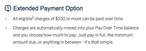 If you hold any Amex charge card, you would know that Amex requires full payment each month.  However, Amex periodically offers select cardmembers the Extended Payment option, which allows full payment each month as well as payment over time (with interest). The offer is usually targeted, and often comes with 10,000 membership reward points just for enrolling!