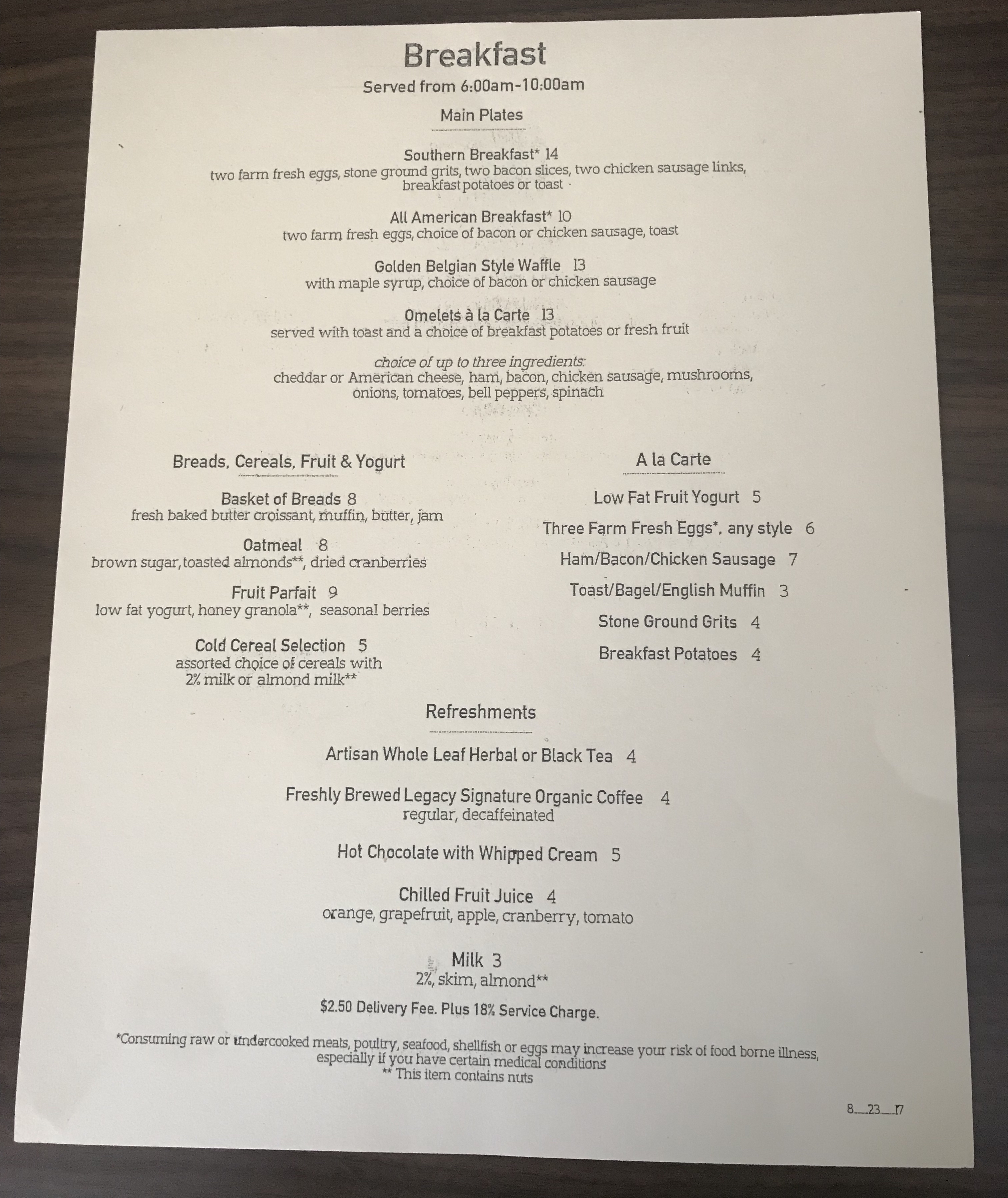 You can also order a la carte, if you wish. This is the menu available in our room for room service. I’m not sure if the same menu is available downstairs, but I’d imagine it is. I’m not sure on the price for the buffet, but given the other prices, I’d guess it’s $15-20.