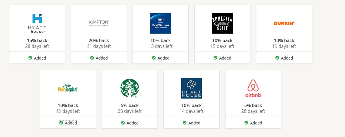 Besides the Airbnb offers there have been numerous hotels and travel sites providing incentives. My most recent offers include 20% back at Kimpton Hotels, 15% back at Hyatt House or Hyatt Place and 10% back at Best Western. Make sure to click on each offer to review the offer details which will vary for each.
