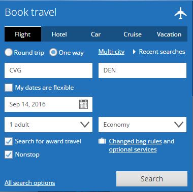 Let’s take a look at a United award travel example. Here’s a flight from Cincinnati to Denver in September without the nonstop award checkbox selected.