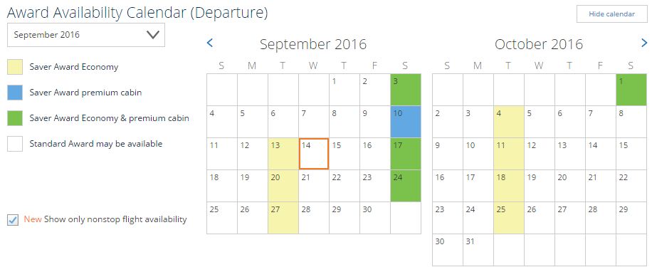 Okay then. So if we want a United saver award flight, we need to fly on Tuesday or Saturday. Good to know! This is a simple example, but for doing more complicated United award booking, a working nonstop checkbox is AMAZINGLY helpful! For example, when trying to help our friends get to Australia, being able to see the dates that have availability on the direct LAX or SFO to SYD or AUK is very useful