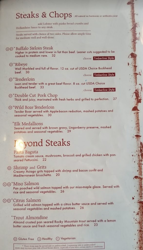 Here are a few screenshots of the menu at the Timberline Steaks & Grille restaurant. Breakfast goes through 11 a.m., and you can start ordering lunch at 10:30 a.m.