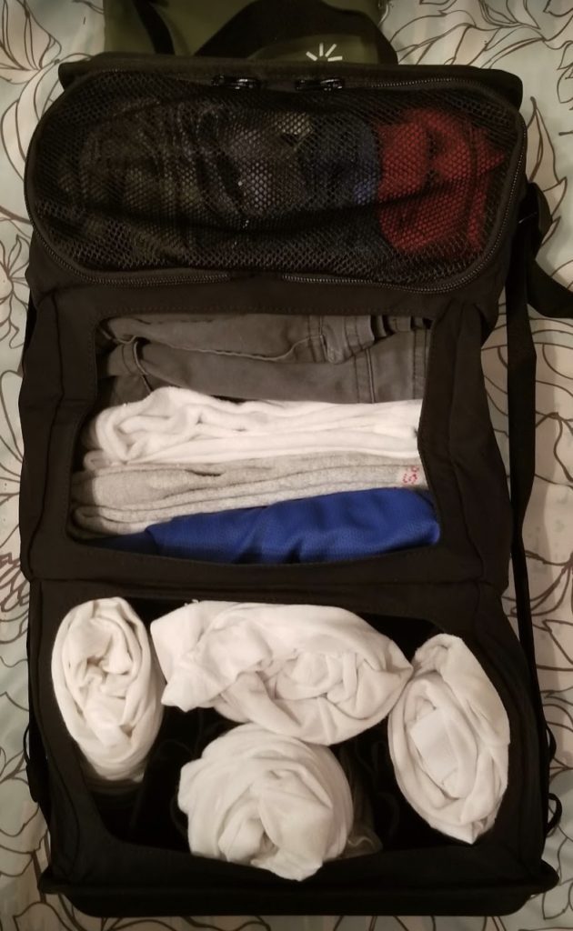 My first step in packing was to pack the black wardrobe pouch with my clothes for the trip. There are several different pouches / compartments, allowing you to separate out different types of clothes.