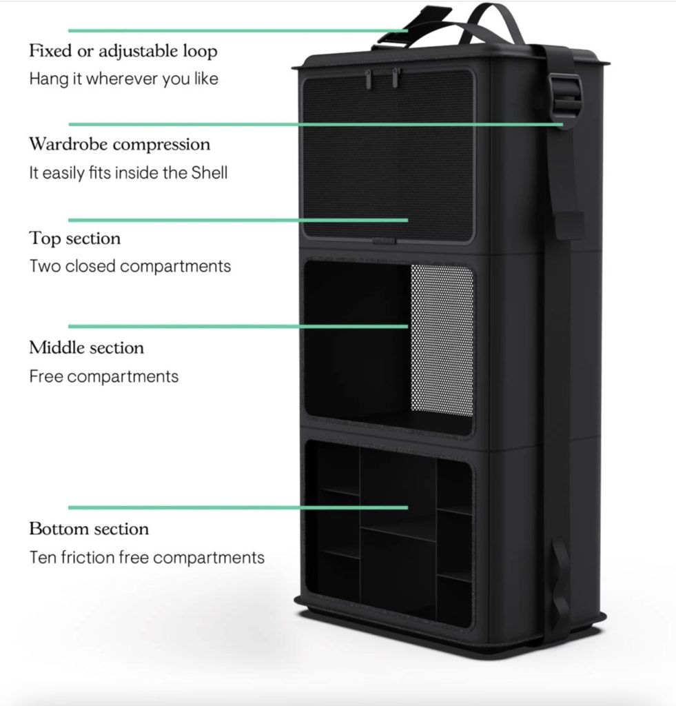 The base backpack itself has a 22L capacity, good for daily use. You can add the Shell Wardrobe system (the black container on the right of the picture above) to give it a 30L capacity for a weekend trip. Then if you’re traveling for longer, it comes with a removable kangaroo pouch on the bottom to bring it up to a maximum capacity of 40L. The Shell backpack is waterproof and comes with Fidlock security meaning that your stuff is as secure as possible.
