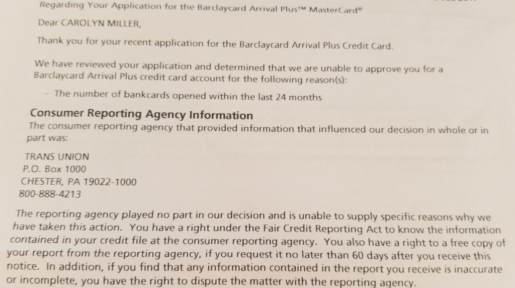 I applied for the Barclaycard Arrival Plus and when I was rejected I immediately called their reconsideration line. It was explained that I had too many new credit cards in the last 24 months. It a lengthy call. I asked how many is too many? I was told that there was no absolute number of cards that would be too many. They said that if I applied in a year’s time I would be fine. They said that this criteria only applied for the Barclaycard Arrival Plus, but not to their other cards. As I had phoned reconsideration on the same day as my application, I turned around and applied for the Wyndham Rewards card that same day, and was accepted without delay.