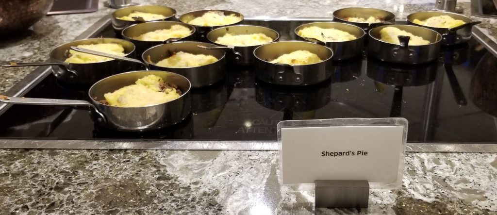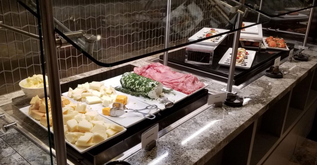 The United Chicago O’Hare Polaris Lounge has a wide variety of hot and cold food on a buffet.