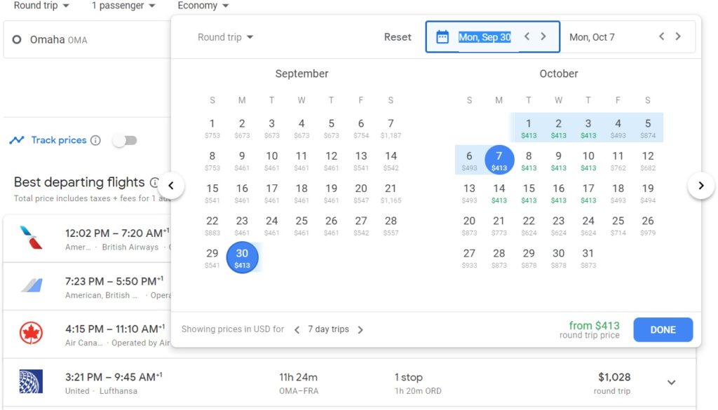 Booking this takes a little effort. First, these prices show on Google Flights but often reprice when you reach the final itinerary. What worked for me was finding the sale dates on Google Flights, then searching on your favorite online travel agency like Orbitz or Expedia. You’ll find sale prices available for late September and most of October. These will ticket at the listed price.