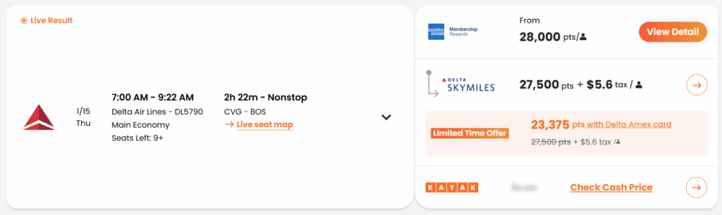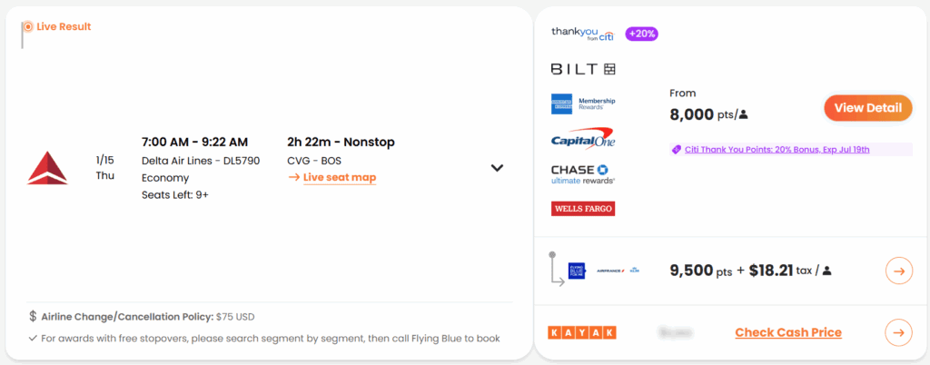 I am trying to book a flight from Cincinnati to Boston in a few months. I pulled up my points explorer website of choice (PointsYeah) and I found