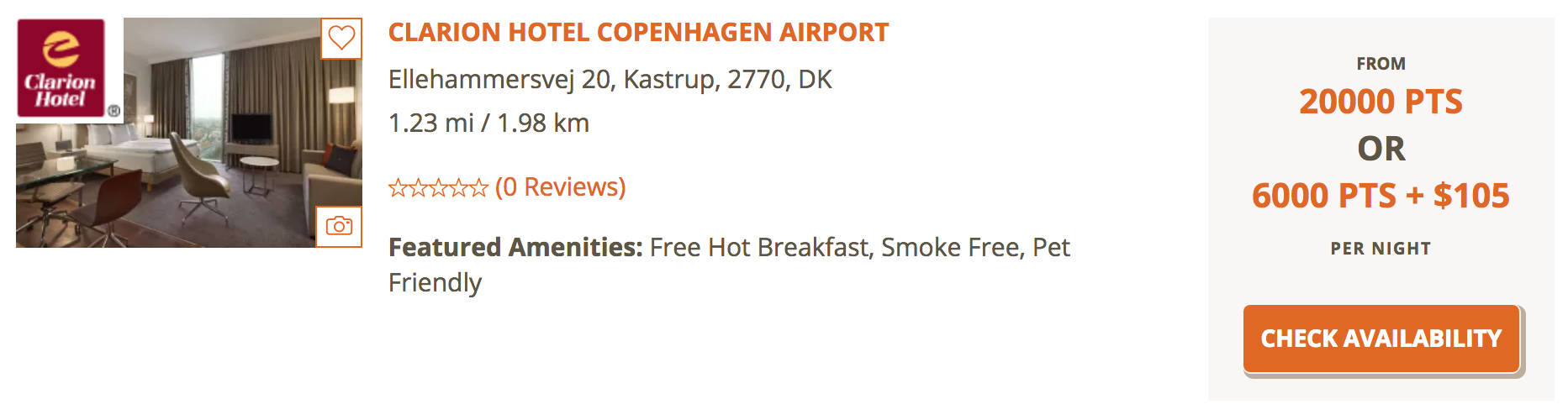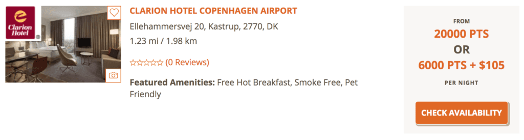 Choice points have high situational value. What may appear like a fairly useless currency for U.S. hotel stays can be gold outside the U.S. For example, I was looking for a hotel near Copenhagen Airport for one night before an early morning departure several months ago (trip was later rebooked, and we didn’t make it to Denmark). There is a Clarion Suites literally across the street from the airport. Cash prices were typically $350-400 for one night. It could also be had for 20,000 Choice points or 6,000 Choice points.