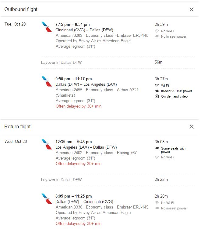 - CVG-DFW-LAX 10/20 7:15p-11:17p  – $224, 2046 miles