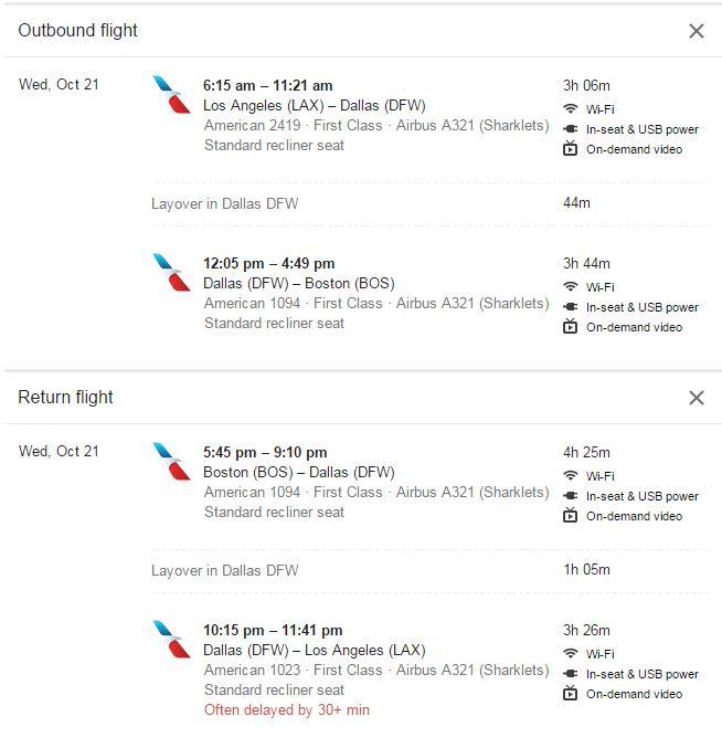 - LAX-DFW-BOS-DFW-LAX 10/21 6:15a-4:49p, 5:40p-12:48a –Â $144, 5594 miles