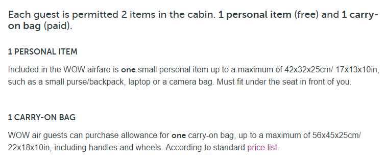The main change made by the Iceland-based budget carrier is this: you are now only allowed to bring one bag on board for free as a personal item. However, this personal item can now be the size of the smaller size carry-on from the previous policy, namely 17x13x10 inches instead of 16x8x8 inches. A “normal” size carry on bag of 22x18x10 inches can now simply be purchased. There is no more carry-on “upgrade”. To recap, that means one personal item of 17x13x10 inches and no weight limit for free, and one carry-on bag of 22x18x10 inches of no weight limit for purchase. From WOW’s site: