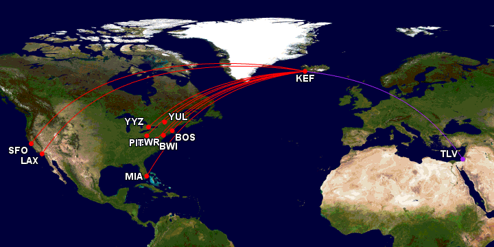 Passengers traveling from Tel Aviv to Reykjavik will then have the choice of vacationing in Iceland or [traveling] onto nine locations in Canada and the US: Montreal and Toronto, Boston, New York [Newark], Washington D.C. [Baltimore], Pittsburgh, Miami, Los Angeles and San Francisco.