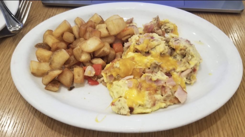 As a reminder, with Priority Pass you get a $28 credit towards anything on the menu. Since I was there early in the morning, I was in the mood for breakfast. I ordered the Meat Lovers Scramble, which came with eggs, ham, sausage and hash browns.